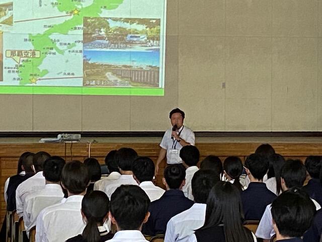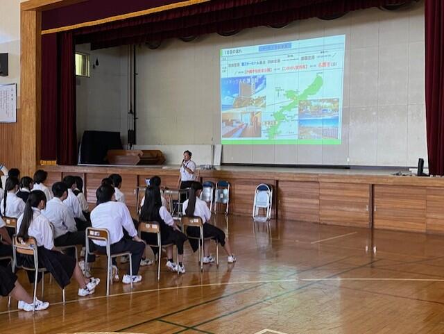 修学旅行の引率でもお世話になるT-LIFEパートナーズの森山翔平氏が来校し、修学旅行の行程を中心に修学旅行でしか体験できない民泊等の説明がありました。説明会の中で多くの生徒が沖縄に行ったことがないとのことで、沖縄の自然や文化、平和学習を通して、得難い学びや経験ができることと思います。