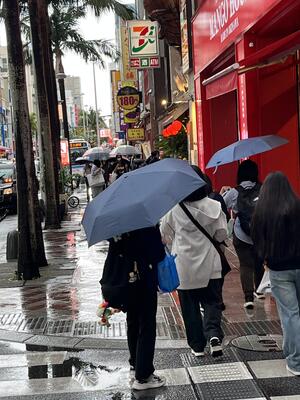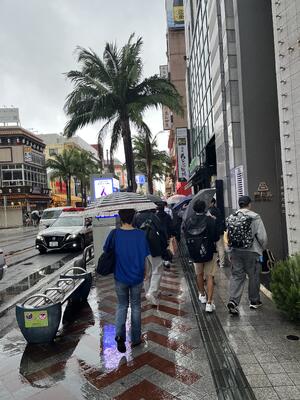 小雨の中、国際通りを散策中です!散策後、各グループで那覇空港へ移動します!