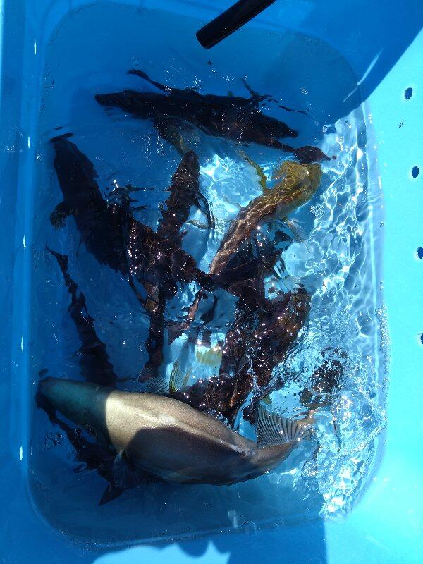 生徒が自ら釣ったイサキに産卵してもらい、種苗生産を始めます。