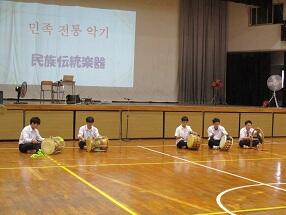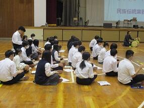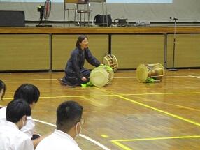 文化や言語についてのお話の他、上の写真のように民族伝統楽器の体験もさせていただき巻いた。楽器に合わせて生徒がボディーパーカッションのようにひだを叩き、会場が一つになりました。