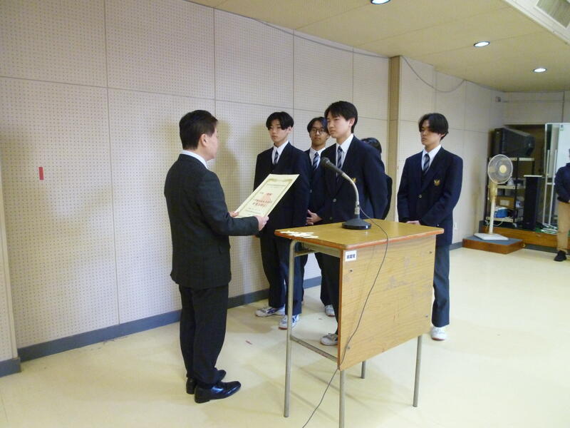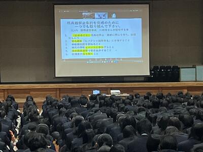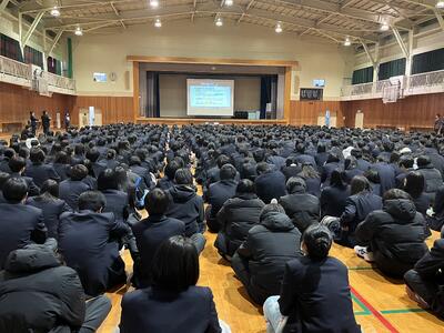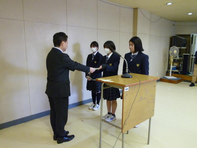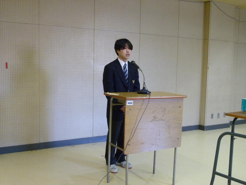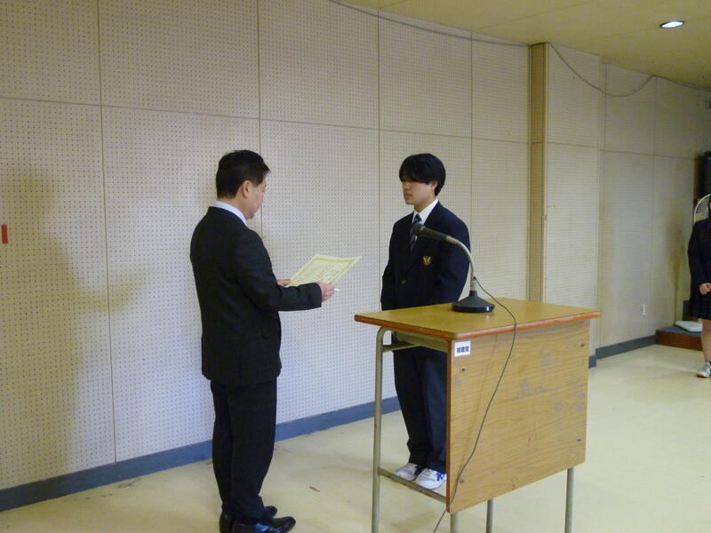 校長先生から「3年生は高校卒業という人生の大きな節目が来る、就職・進学といよいよ実社会へ船出の時、2年生は3年生になるといよいよ自分の人生を方向付ける進路決定の時期、1年生は高校にも慣れ、これから学校の中心的な存在として活躍する時期、それぞれ今学期の頑張りがその後の飛躍に大きく影響してくると思う。時間を大切に日常生活からベストを尽くす、置かれた状況の中で自分に今できることを勉強でも部活動でもボランティアでも家の手伝いでもよいので、何かできることを見つけて充実感・達成感を得てほしい、自信がつけばさらに将来を考え、より高い目標に向けて努力するためのモチベーションも上がると思う。自分の成長とともに、他の人に嫌な思いをさせることが無いよう、他人の立場に立って物事を考えられるようになってほしい。」とお話がありました。