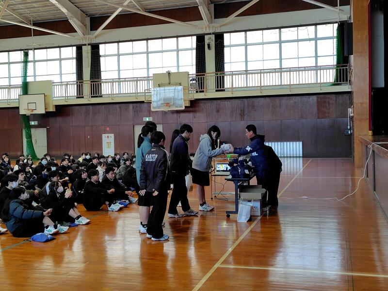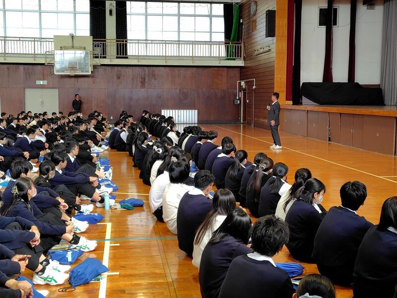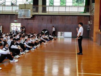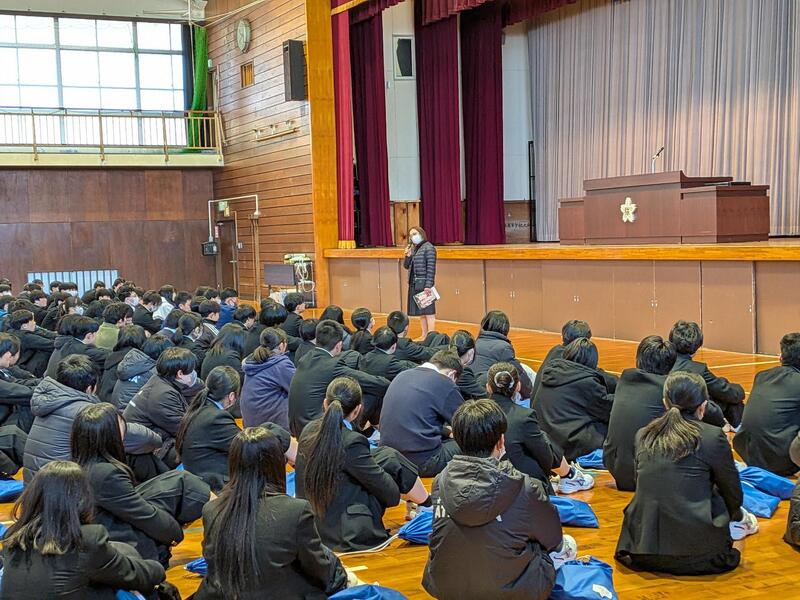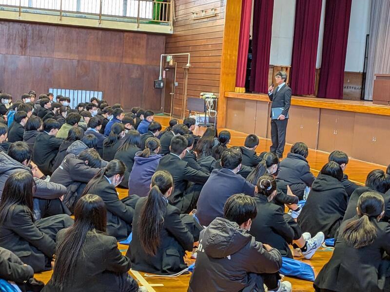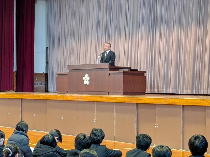 体育館で行われた全校集会では、校長より「七難八苦」の故事や本校の校歌の歌詞にある「百難千苦」を引き合いに、困難を乗り越えた後に喜びがあり、失敗を恐れず挑戦してほしいとの訓話がありました。また、平山治子進路指導主事からは、高校卒業後に出会うであろう全国各地の様々な人たちから受ける刺激等への期待を話していただきました。