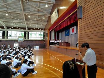 1年生は校歌・応援歌の指導がありました。特別に野球部・吹奏楽部の皆さんがお手本として、一緒に取り組んでくれました。早く校歌を覚えて、2・3年生のように元気に堂々と校歌を歌えるようになってほしいです。