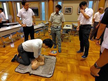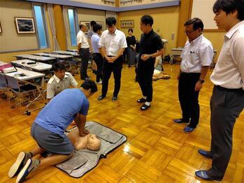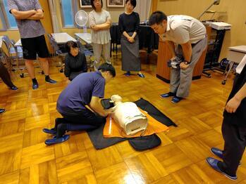 東消防署の署員のみなさんを講師に、救急法の職員研修を行いました。AEDの使用方法について正しく学びました。