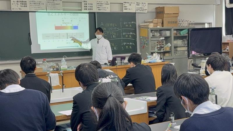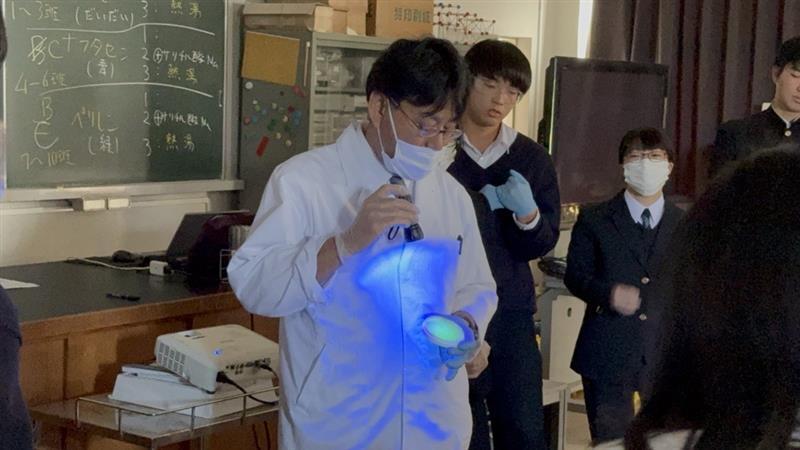2年次生の理数科1クラスと普通科理系2クラスの計3クラスの生徒たちを対象に、大学の先生を講師にお招きして出前実験授業を実施していただきました。今回は本校が日頃よりお世話になっている城西国際大学より、薬学部准教授の西口慶一先生に『化学反応の速さ』をテーマに、「化学発光」の実験を行っていただきました。