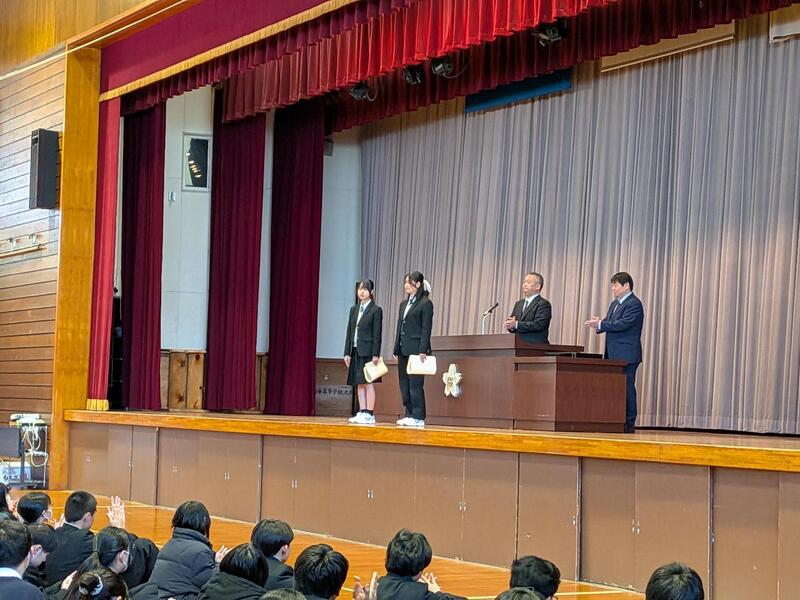 賞状伝達では、青少年読書感想文千葉県コンクールで優秀賞と優良賞を受賞した2名、関東高等学校選抜新人陸上競技選手権大会女子ハンマー投げ第5位の成績を収めた1名が、それぞれ表彰されました。おめでとうございます。